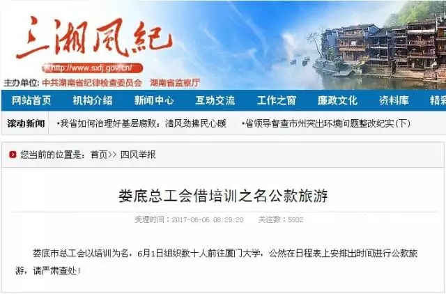 6月6日,收到群众反映娄底市总工会以培训为名公款旅游的举报后,娄底市纪委、市委组织部组成联合调查组对此事开展全面调查。