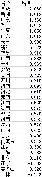 从常住人口的增速来看,共有6个省份的增速超过了1%,分别是西藏、新疆、广东、重庆、宁夏、山东。除了广东和山东这两个沿海大省,其他省份都位于西部,出生率也都比较高。