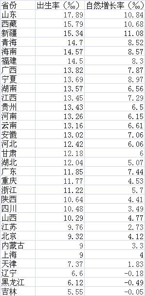 从出生率来看,有14个省份的出生率超过13‰,高于全国12.95‰的平均水平。其中山东以17.89‰的出生率位居各省份第一位。西藏和新疆分列二、三位,都超过了15‰。此外,青海、海南、福建、广西和宁夏分列四到八位。