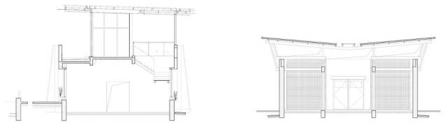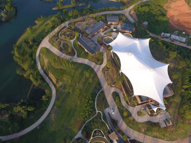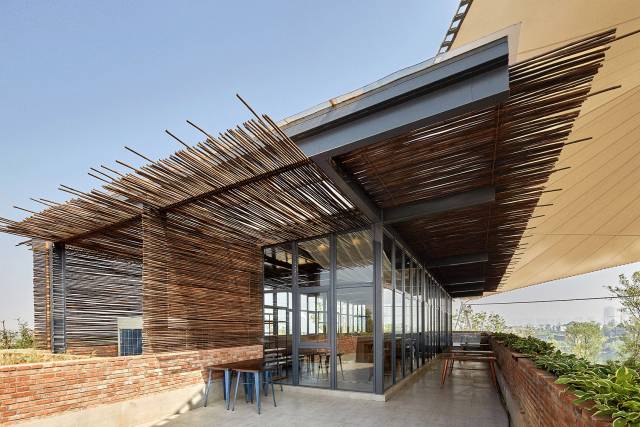 二楼会客休息空间整体用了玻璃立面,使建筑更为轻盈,屋顶用了乡土材料-竹条,使轻盈感向外延伸。