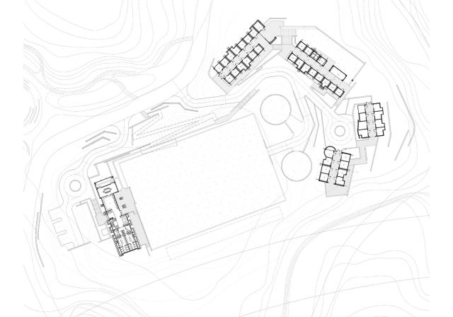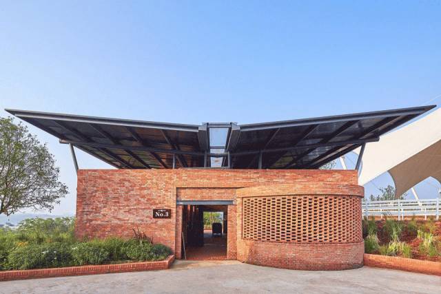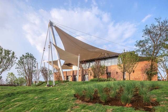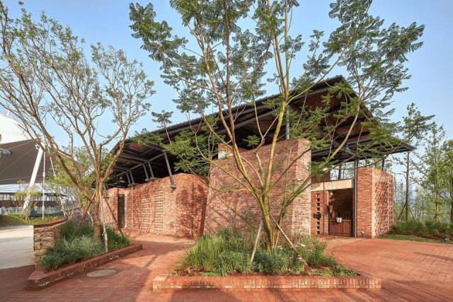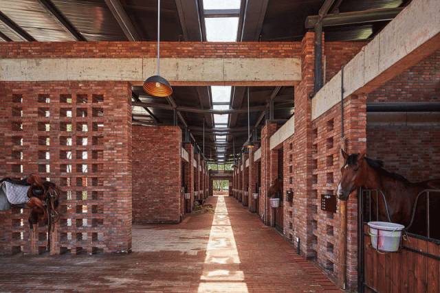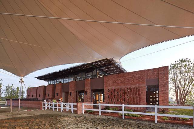 马场位于麓湖生态城麓客岛,以中国传统材料——红砖作为建筑主材。麓客岛三面环水,马场在岛的最高点,在细腻精致的环境瞩目下,红砖马场也以它充满韵律的细节处理为场所带来趣味。