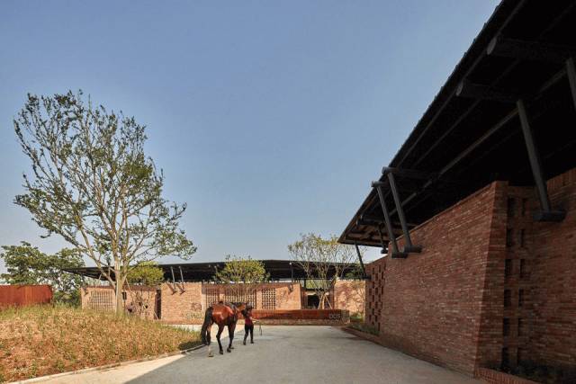 马场的设计重视了传统技法和自然材料的使用,在了解中我们也知道砖结构的马房具有寿命长,维护成本低和耐火性的优点。但砖的最大问题是结构形式,传统意义的砖混由于承重的影响,无法在立面上做过多的手法,我们想做的镂空砖的拼法和表现效果都会受到限制,无法让建筑师做更自由的表达。因此我们加入了框架结构,让砖跳出了承重墙的桎梏,做到更自由的表达,同时对过梁的收边和檐口做了特别设计。