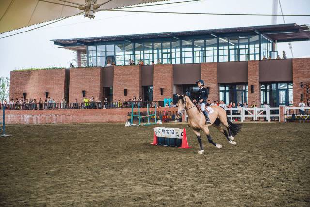 接待中心建筑需要提到的是由功能而生成的形式。外部呈现的渐变体量感正是由于功能由内向而转为外向的暗示。最端头的会议室在设想中是一个完全与外部环境交互的空间,因此我们研究使外立面整合了玻璃透明砖和红砖两种尺度和材料,设计上拉出一个小小的院子。从会议室看出去,两侧星星点点的透光,正面完全交融通透的院子。人们站在院子的顶,二层平台上看下去,朋友或是孩子在场地里的马背上仰头和你打招呼。