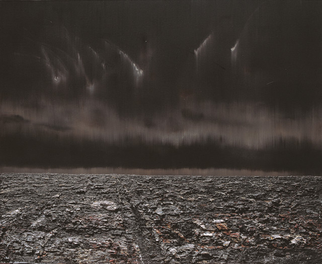 段江华在画面上用极为浓重的笔触描绘了建筑物,它们都是由高出画面达5到10厘米的颜料玑理所构筑的,这使得画面的这一部分图像极为厚重,并且与薄涂的天空形成强烈的视觉对比。画面的颜色以黑为主,以此加强了所谓的历史“沉重”感。可是,天空似乎在画面上占据了更为主要的位置,天空的面积很大,虽然是薄涂,但纵向的笔触,加强了至上而下、或者至下而上的流动感。黑暗的天空透出光芒,有时很亮,有时很微弱,但即便是微弱的光也掩饰不住天空中空气的动感。正是这种动感,使得画面有了鲜活的灵性——在灵动的天空下,如废墟般屹立的建筑物才有了纪念碑的特质,才焕发出不朽的光辉。这样看来,没有广阔而灵动的天空,人类试图“不被遗忘”的结果是很难达成的。