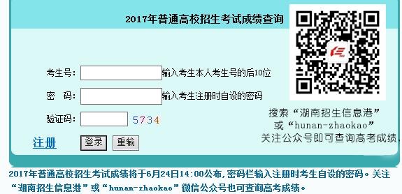 二是网站和微信平台查询。登录湖南招生考试信息港(http://www./) 或湖南考试招生微信公众号(扫描下方二维码),由考生输入考生号和密码查询。