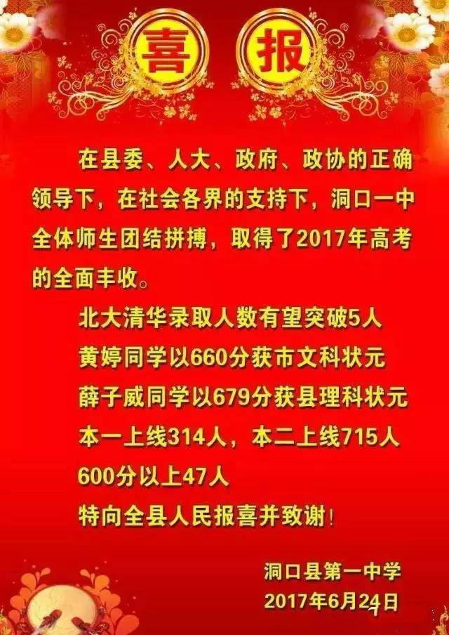 清华、北大录取人数有望突破5人。600分以上47人,一本上线314人,二本以上715人。