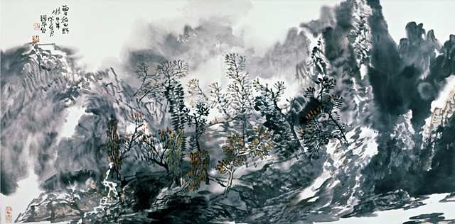 就此而言,杨国平的水墨画带来的是崭新的绘画资源,带来了一种神秘和解密的同时存在、氤氲淋漓的山重水复、幻化莫测的水墨境界。杨国平的水墨山水画,富于流动感,这种运动的态势成为作品最基本的精神指向和内在结构,在游刃有余、从容不迫的挥洒中,水、墨、色、笔的互动,造成了画面的元气淋漓、氤氲酣畅、波澜突起的节奏变化,而率性的意象表现与水墨技法的娴熟常有出人意料的效果不期而至。这一切,当然显示了画家对水墨艺术不同寻常的感受能力、认知能力、把握能力与表现能力。