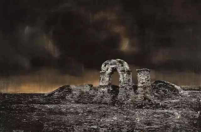 透过这静止、凝固令人窒息的场景,仿佛看到的绵延中的人与自己营造的物体共同被一种不可知命运任性地淘洗和异化的结局。艺术家挖掘和想象时间痕迹的图像,并在这痕迹中注入历史时间意识流带来的“破坏性”意味。由此演绎出“废墟”的图式。让这种“废墟”图式作为人类文化的瞬间定格,不仅以个人的方式展开对某种文化样式现状和轨迹的演绎,同时也表现一种对文化和历史的感知方式,联系着刻骨铭心的感情和思考。