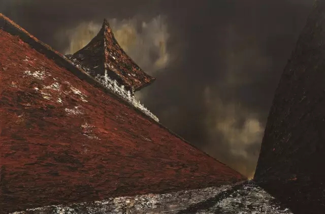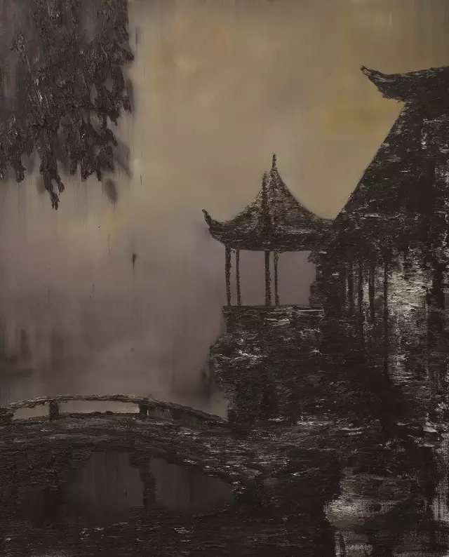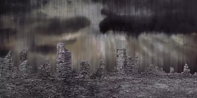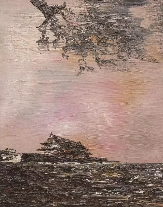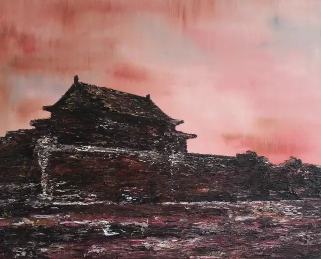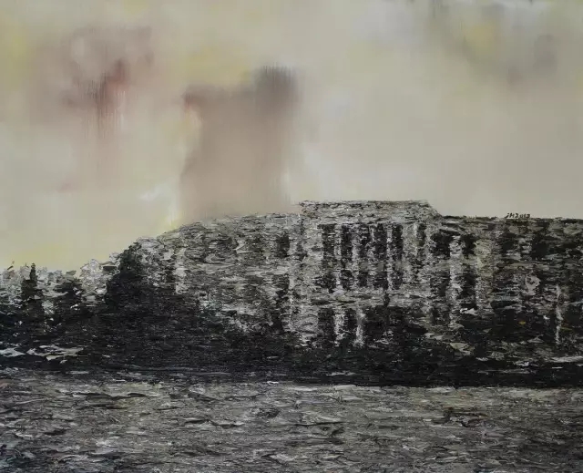 段江华画出了城市的物质感,画出了城市的肌理。城市,被抽象化为几个巨大的建筑物。城市的其他部分好像被建筑物吞没了,被建筑物的高度和庄严吞没了,它们只剩下隐隐绰绰的身影,一些矮小建筑和街区的身影。建筑物的挤压通过颜料的堆积越发显得挤压。颜料反复地堆积反复地涂抹,城市就越发显得挤压,越发显示出它巨大而拥挤的物质性,越发显示出物质本身的厚度和强度。这些城市和建筑物,像是置身于一片荒漠中,被一片阴霾的天空所包围,墓气息沉沉。城市,就是这样一个巨大的物的怪兽。在此,建筑和物质本身既构成了现代城市的风景,也成为绘画的风景。