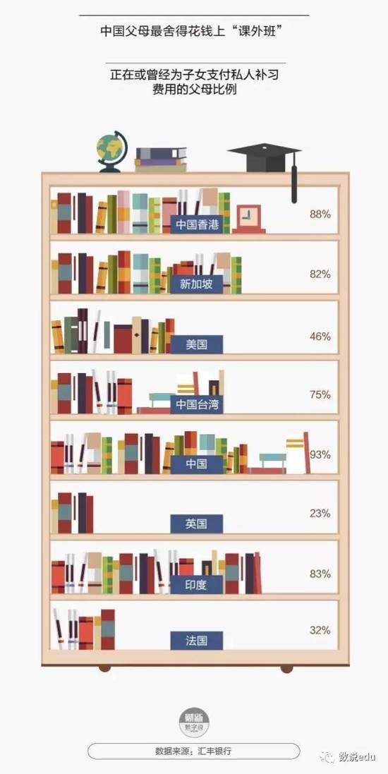 在私人辅导方面,中国有93% 的父母给孩子请私人辅导,排在世界首位。除了教育经费外,有 82% 的家长为了孩子的成功准备做出个人牺牲。有 33% 的中国家长减少甚至停止休闲活动与假期。