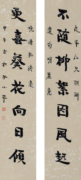 孔小平对联作品《不喜柳絮因风起 更喜葵花向日倾》(纸本 19x86cm 2014年)