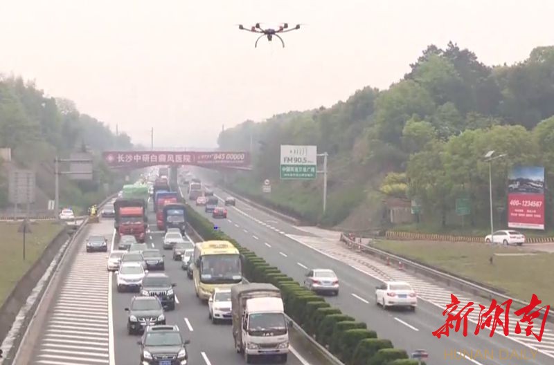 (9月5日上午,湖南高速交警操控无人机从长沙星沙收费站飞到京港澳高速与长永高速的牛角冲互通,通过无人机画面可以实时看到该路段车流量较小,路面情况平稳。)