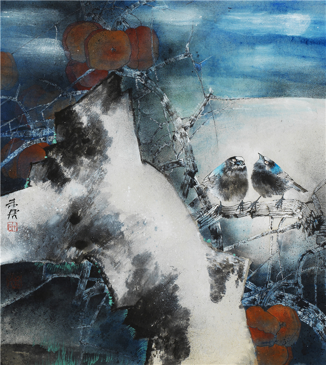 孔圣人说:“志于道,据于德,依于仁,游于艺”,以“游”贯穿于艺是一种深刻的内心体验。在当下注重形式表现的展览时代和重复自己的商品代价,画作的浅俗往往是内在心灵素养的忽略。未君的中国画色彩优雅,构图严谨,画面雅俗共赏,生机盎然却又涌出一种莫名的忧虑感。如《老树新枝》和《多少春色留不住》中的新绿和枯枝形成鲜明对比;又如《梦蝶不知秋》《云水香容图》中那厚厚的浓雾,不仅让画中之鸟迷惘,更是让我们作为读者之迷惘。我们迷惘,是因为我们活在当下这个艺术“错乱丛生”的时期,我们许多艺术家能否透过浓雾看清自己,看清作品背后那些漂泊的艰辛?细细品读未君的每一幅作品都能让我激动并让我沉思良久,我认为通过未君的作品是可以增加一个人的品格修养和学问修养的,也能让人产生对当下画坛现状与趋向所表示出关切与忧患,产生出真正作为一名画家所肩负的责任感。其实,忧患意识本身就是一种责任感的表现。因为,只有忧患,才能把人从失落的人文精神、从定型的生存状态、从固有的思维模式中解救出来,以产生一种传承与突破的追求,以达到超越的欲望,只有这样,艺术境界才能更上一层。画家只有提升学识修养、人生境界才能得以提升,这是中国画传统的文脉,也是未君中国画的第三层意义!