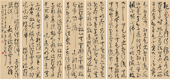 我以草书演绎《心经》,追求简省连绵的草书笔调和舒展飘逸的艺术风格,提按扭转、穿插摆荡、横扫竖抹,有如公孙舞剑、关公捋髯、嫦娥奔月、惊蛇出草,寓极静谧与极灵动之中,展示禅宗“万古长空,一朝风月”的空灵境界。