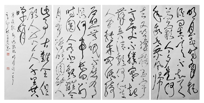 这一次王宏写的作品,内容大都是选的毛泽东和苏轼的诗词,一个是雄才大略的开国领袖,所有关于大气的词语用在他身上都不过分,一个是宋代的豪放词的开山祖师,他的诗词流传千古,经久不衰。先声夺人的总是最有气势的,《沁园春 长沙》是毛泽东赞美长沙,抒发少年豪情壮志的千古名篇,毛泽东本人在近现代书法家中也是声名显赫,继他的原版之后,王宏所写的这一幅狂草几乎是最豪华的版本了,版面极大,用了两张八尺宣纸,大气磅礴,变幻莫测,不可端倪,这样的大手笔,常人是难以想象的,极富表现力和感染力,一种坚强的跃动的生命力呼之欲出。大幅狂草最能淋漓尽致地表现自我,可是前提是自我丰富,有底蕴,不然,表现什么呢?王宏在这幅字的创作中尽情舒展,看了这幅作品,你可以想到壮士拔剑,你可以想到长风破浪,你可以想到暴风骤雨、闪电迅雷,豪迈的气概、进取的精神扑面而来。这样的篇章是需要笔力和技巧的,心力更是不可或缺,这幅字刚劲的笔力、纵肆的结构兼以极快的速度成就了咄咄逼人的气势,站在这幅巨作前,如在烟云中,被墨香笼罩,被墨气缭绕,都有些氤氲了。