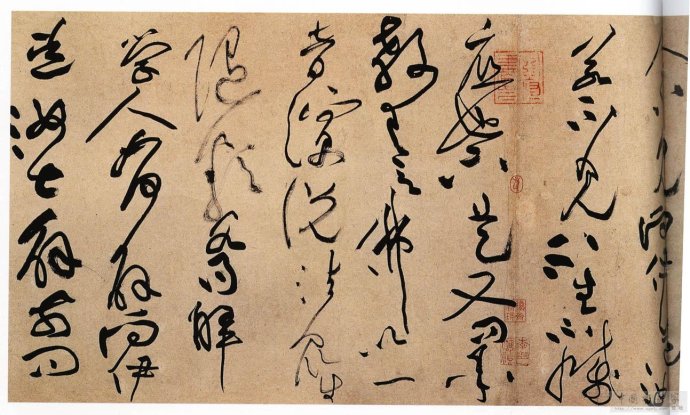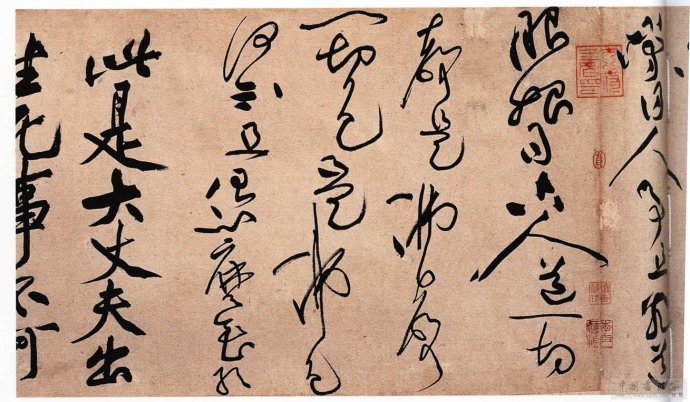 其次看结体。《诸上座帖》字形结体,最显著的特点是中宫收紧,四肢展开,点画伸张,呈辐射状。他的草书体现了师古与师造化的统一。他在《山谷题跋》中自称在黔中时,“及来僰道舟中,观长年荡浆,群丁拨棹,乃觉少进”。说明自己人从船工荡桨,群丁拨棹获得了启示,使他的字撇捺拖出,长笔恣意,纵横舒展,体势欹斜,四面出锋,极似船工长桨拨水。相同的字写得千变万化,是《诸上座帖》的又一个特点。从第四行起,四、五、六、七、八行中连续出现“执着”二字,五处“执着”,轻重徐疾,枯润相间,结体纵横圆转,欹侧取势,大小错落,各不相类,精采纷呈,妙趣横生。韵律美是《诸上座帖》结体的第三特点。《书概》云:“山谷论书最重一个韵字,盖俗气未尽者,皆不足以言韵也。”黄庭坚品评书艺时,常将“韵胜”与“俗气”作为对立面来论述。《诸上座帖》行列无定规,大小无定矩,摆荡穿插,险中求稳,星罗棋布,出人意料,局部的变化与整体韵律节奏相糅和,相呼应,相统一。