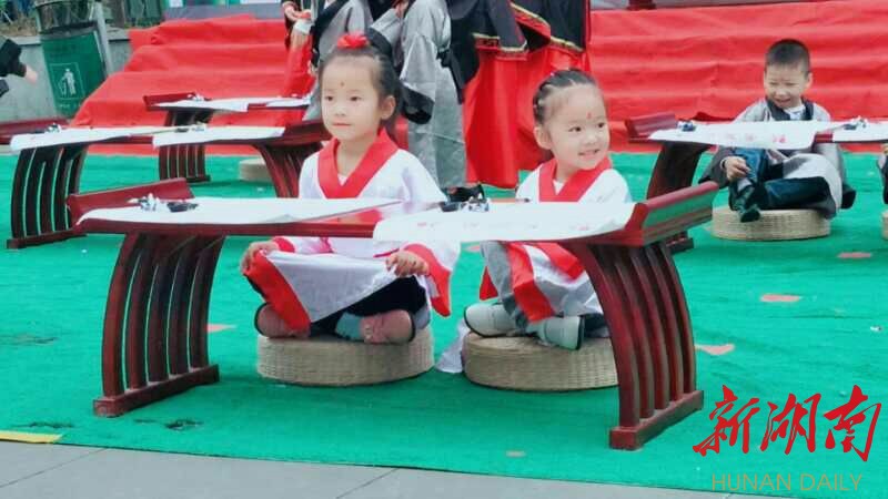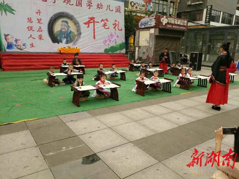 “开笔礼”在幼儿园老师们表演的舞蹈《重回汉唐》中拉开序幕,儒雅的服装、优美的舞姿引来千余群众围观、拍照,小朋友们拍着小手为老师喝彩。