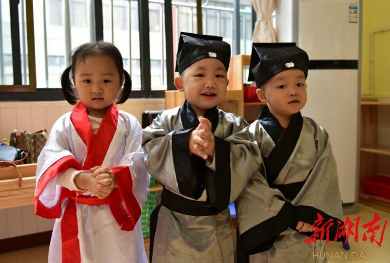 “正衣冠”是家长和小朋友们进行的第一项礼仪,在老师的口令下,礼仪二班的小女孩邓诗菡把额头和耳际的头发捋整齐了,小男孩张铭轩翻了翻衣服的领子,把两个大衣袖拉直了。