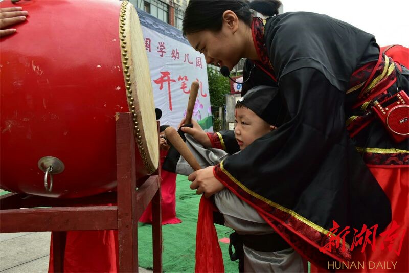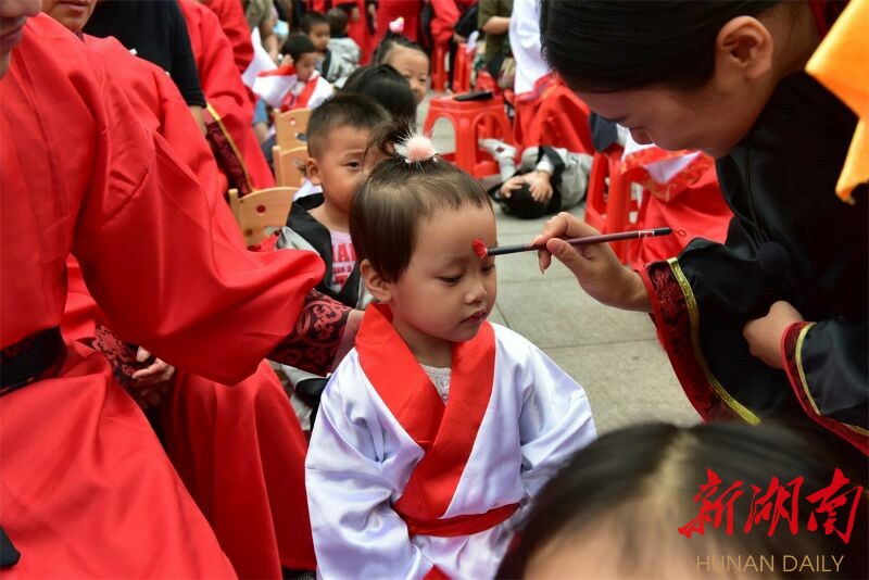 伴随着悠扬的古乐声,老师们端起朱砂,各班班主任手执毛笔,在小朋友的额头正中点上红痣,为学子们祝福。
