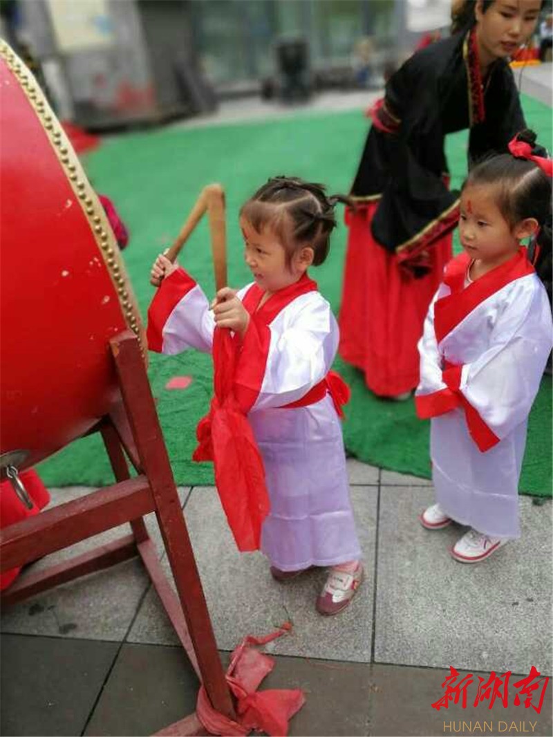 击鼓明志、宣读告文、家长敬茶、释菜等礼仪中,家长和小朋友们做得有模有样。