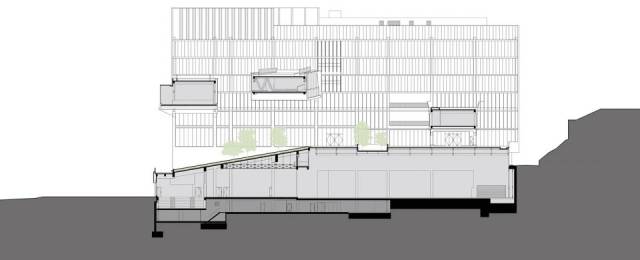 ▼大面积的功能空间如图书馆和大型教室等悬挑在主体建筑外