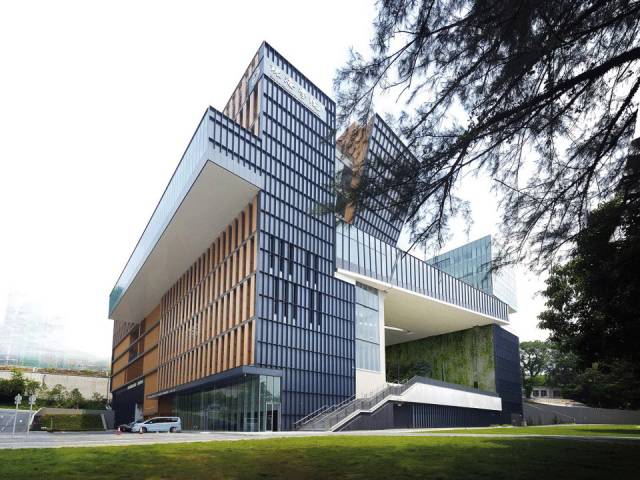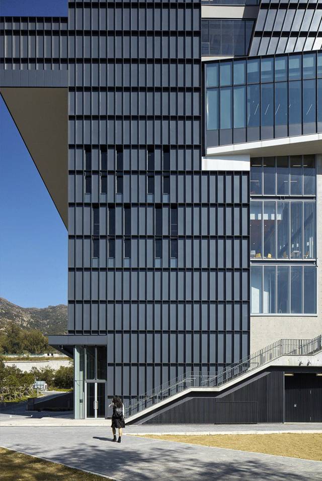 图书馆桥及学生会桥横跨裙楼草坡上空,既连接了东、西两翼,亦构成了一个标志性门廊。 建筑设计尽量减少占地面积以腾出最大的公共空间。大面积的功能空间如图书馆及大型教室等则悬挑在主体建筑外。建筑体块从主楼向各方悬挑而出,有如一座巨型树冠,象征了于树荫下乘凉学习的远古传统。