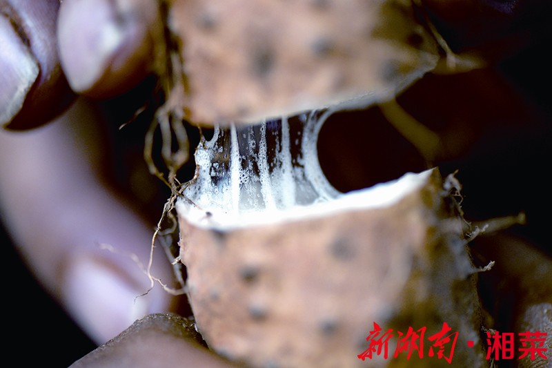 在质感上,青树坪淮山有“软、粘、糯、粉、甜”等特点,格外地滑嫩、绵软、细腻,轻轻地掰开一截,断口处有着清透绵延的缕缕银丝。