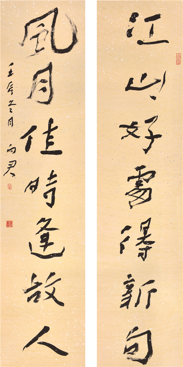 崔向君作品《江山好处得新句 风月佳时逢故人》(行书对联 134cm×34cm×2)
