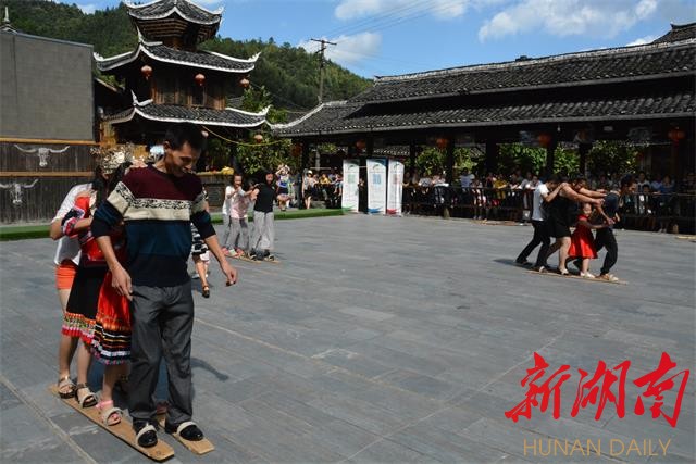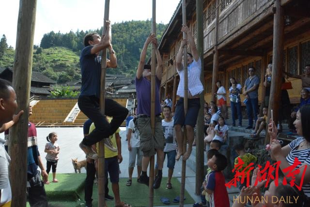 新湖南客户端10月2日讯(通讯员 陈俊名)“玩的很开心,再住一晚!”10月1日,国庆长假第1天,来自北京、安徽、广西等地数百名游客带着小孩涌入《爸爸去哪儿2》拍摄地靖州地笋苗寨,刚欣赏完民俗表演的安徽游客李昆仑得知今晚还有亲子体验式篝火晚会,与家人商量决定再住一晚。