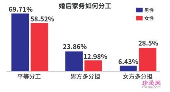 调研发现,90后中有69.71%的单身男性和58.52%的单身女性希望家务活“平等分工”。另有23.86%的90后单身男性和12.98%的女性也表示家务活应该“男方分担多一些”,可见男性在家务分担方面的观念有所提升。同样也有28.5%的90后女性和6.43%的男性表示家务活应该“女方分担多一些”,体现出女性体谅丈夫养家的辛苦。