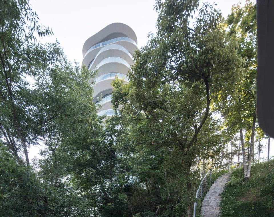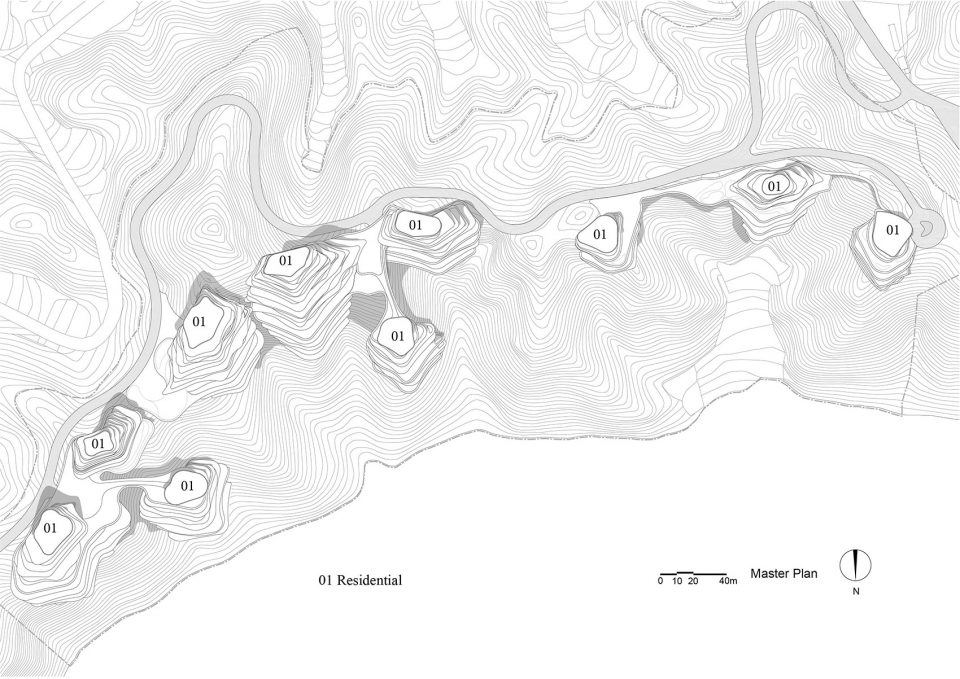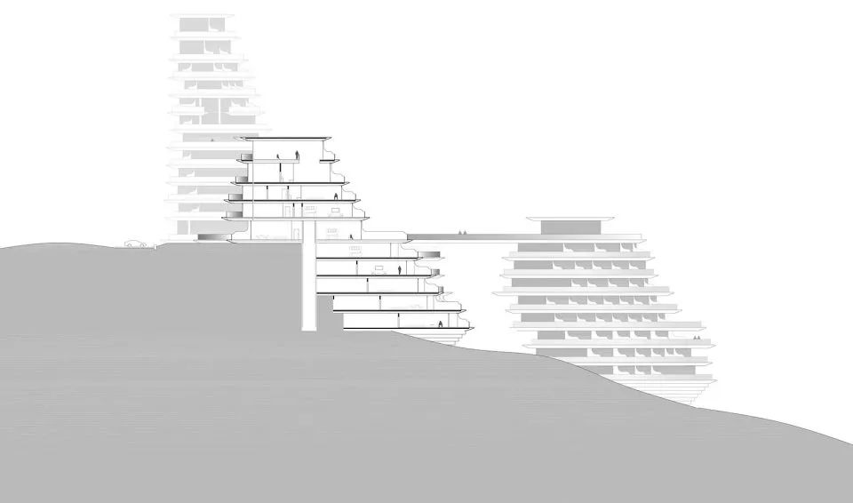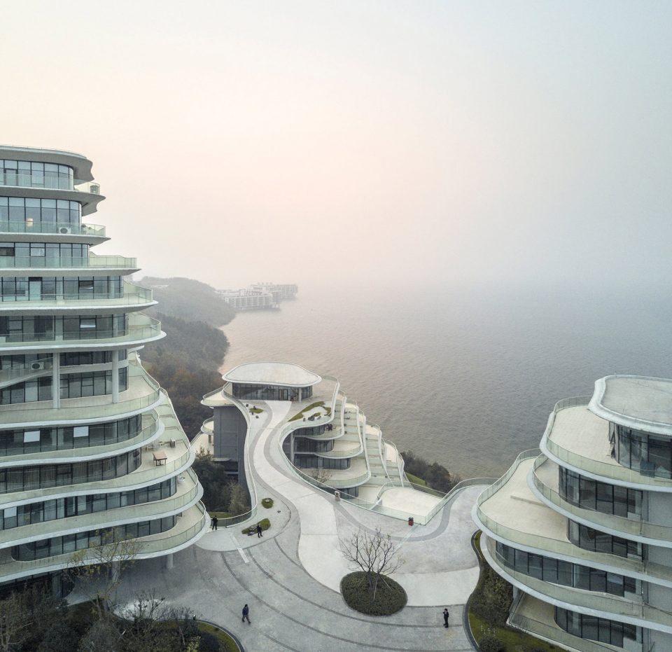 十栋依山傍湖的建筑中,房间均面向湖光美景以及远处的绵延群山。建筑每层阳台有机流动的线条,依据所在地山丘原有的等高线而设计,每处线条都是唯一,这是建筑跟地形最好的结合。宽阔的阳台将公寓内部空间延伸到室外,人们置身其中,像是真正生活在大自然里一样,随时可与山、湖、天、地对话。建筑与建筑之间由自然景观、廊子和步道小径连接在一起,人们在其中既可缓步至湖边小码头,也可登高望远。山、水、天、地,如幻、模糊却尽是真实。