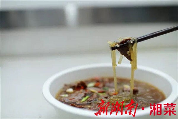 由牛肉、红薯粉、八角、桂片水煮,再炒制而成。牛肉一定要切成大片,与顺滑的本地红薯粉极其搭配。
