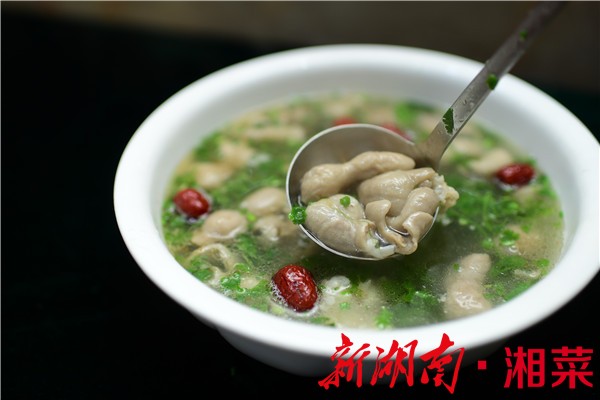 1、湘阴炖肠:湘阴宾馆出品的这道炖肠,菜如其名,没有太多复杂的配料,就是把猪大肠处理干净,剔除油垢汆水。净锅上火,放入清汤、姜片、猪肠、红枣、莲子、胡椒粉,大火烧开后转中火炖四十五分钟,调味撒上一把香菜即成。经过了大火转中火炖煮后的大肠十分软嫩,姜片把腥味去得极为透彻,胡椒的鲜香微辣透过高汤入口,一口热汤,一股热流,倍感温暖。