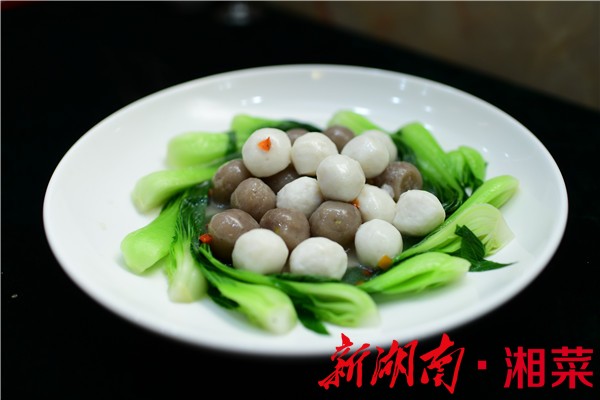 3、荷塘双秀:“双秀”是哪两样?自然是鱼丸和藕丸。这道菜取名十分巧妙,因为草鱼和湖藕都是生长在荷塘之中的。湖藕去皮洗净后用搅碎机打碎,加盐、少许鸡精,揉成圆形藕丸。同样,将草鱼肉搅碎,加盐、姜、葱末、鸡蛋清、猪油打好,捏成鱼丸。将蒸熟的鱼丸和藕丸摆入盘中围上菜心,淋汁即可。双丸口感细嫩,鱼丸劲道有弹性,藕丸清新留有甘甜,二者放在一起,浑然天成,应景应名。