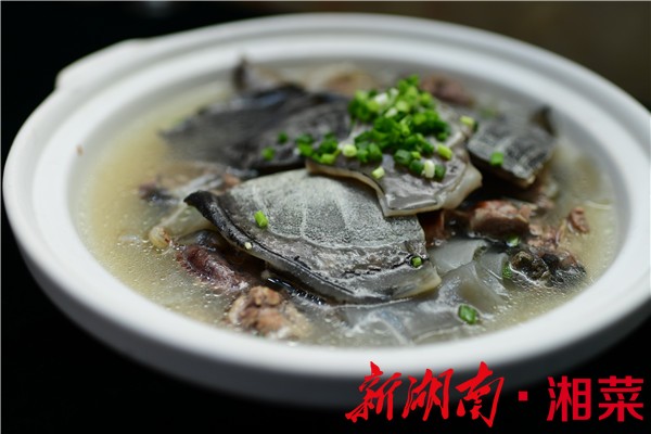 4、湘阴水鱼炖粉皮: 帝豪酒店出品的湘阴水鱼炖粉皮也是湘阴“十大名菜”之一。水鱼斩杀,去内脏清洗干净后剁成块,过开水,去浮沫。锅内放油,下生姜、五花肉煸香,将水鱼入锅翻炒两分钟,撒入胡椒、盐、鸡精和少许味精调味,加入高汤小火慢煨三十分钟倒入泡好的红薯粉皮,再慢煨十分钟,出锅装盘即成。高汤下的水鱼肉滑嫩不腻,表皮鲜亮,筷子上的水鱼来回翻弹,可见其柔韧之度,舀上一勺水鱼汤,吃上一口水鱼肉再回蘸一下汤汁,新鲜香醇,补中益气。野生水鱼实乃不可多得的上乘滋补佳肴。