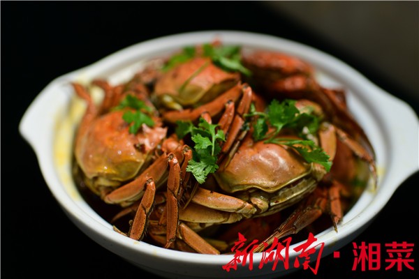 6、鹤龙湖口味蟹:鹤龙湖水质清新,湖内资源丰富,盛产闸蟹,水鱼等湖鲜。本次选用的鹤龙湖大闸蟹均为三两母蟹,这是鹤龙湖镇的特产,其特点是:青背、白肚、金爪、黄毛。曾荣获2010国际农博会金奖。以往大闸蟹我们都是选用了清蒸的做法来保留螃蟹原本的鲜美,这一次又大胆创新,做成口味蟹。净锅置旺火上,放入植物油烧至六成热下螃蟹过油断生后倒入漏勺沥干油。再在锅内留底油,下姜末、蒜末、野山椒末、尖红椒、干辣椒段煸香,再放入螃蟹烹入料酒炒香,倒入鲜汤,加精盐、味精、耗油、紫苏叶调好味,中火烧透入味,旺火收汁,淋上香油即成。扯下一个蟹腿,浓烈的辣汁渗透到了蟹肉的每一处纤维中,细嫩中透着鲜辣,更有饱满多汁的蟹黄,让人忍不住大呼过瘾!快哉!