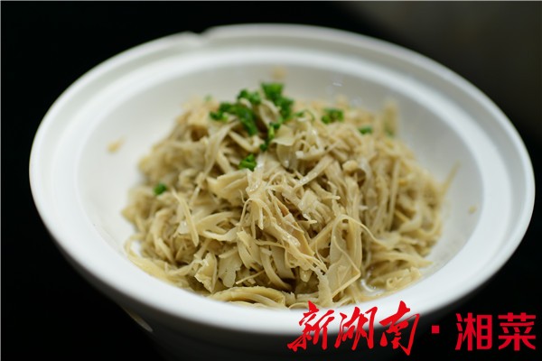7、东塘家宴笋:能把一道素菜做出荤菜的味道来,湘阴出品,必出精品。东塘家宴笋用其独特的味道征服了在场食客们挑剔的味蕾。选用了上等高山脆笋尖冷水浸泡一整天,切丝开水煮三十分钟去异味,漂净挤干水分,锅内放入肥猪肉炼油,加入笋丝炒香,倒入鸡汤,小火慢煨两小时,调味出锅装盘撒上葱花即可。笋丝早已入味,鸡汤的浓香原原本本地与笋丝融合为一体,用最简单的食材呈现最不简单的味觉,东塘家宴笋做到了极致。