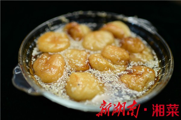 15、农家糯米粑粑:老少皆宜的白色农家糯米粑粑下锅炸至金黄,熬好糖汁后与糯米粑粑翻炒均匀,出锅前撒上芝麻。这道甜点,粑粑外壳焦,里面软糯粘牙,包裹着满满的糖汁,整个甜到心里去了。
