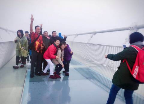 在大峡谷玻璃桥,虽然雨后雾浓,仍抵挡不住一波波游人的热情。