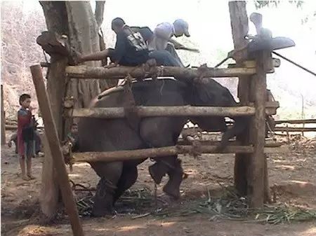 驯象者有一些特制的小笼子,用来惩罚大象。大象被关入后无法动弹,转身,更无法躺下,没吃没喝,还有人会拿石块扔它们。