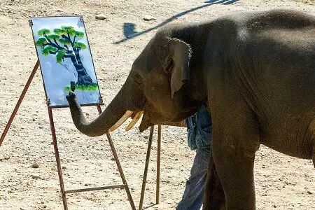 泰国的Maesa大象基地首创了大象作画表演:基地的小象两岁就面临母子分离,幼象要经历包括饥饿、桎梏与击打的驱灵仪式,直到其精神完全崩溃全心全意服侍主人为止,之后它们才可以学习作画。