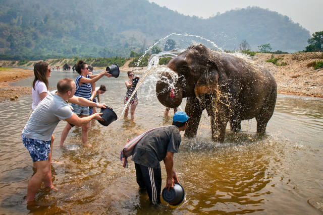 在这座大象公园里,游客们可以喂大象吃新鲜的水果,观看他们在泥巴地打滚玩耍,或者与他们一同散步甚至是跟他们到河里一起洗个凉快的澡。