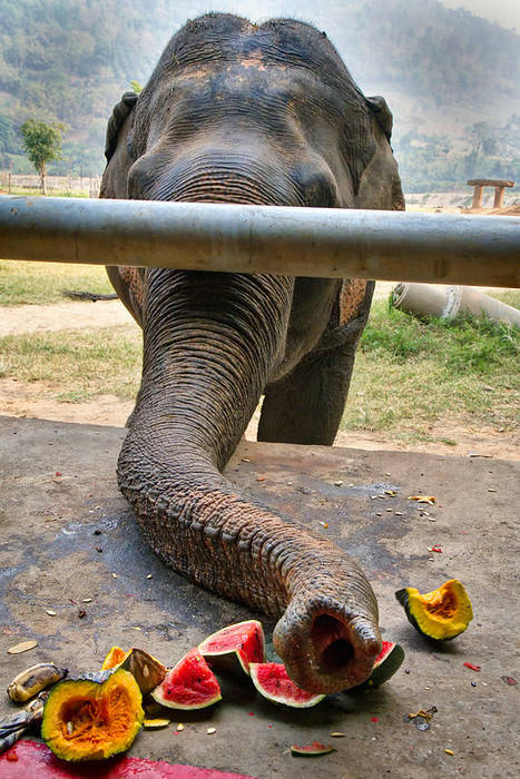 野生的亚洲象在野外每天会摄取新鲜的叶子和蔬果,在这些地方,它们只有干棕榈叶可以吃;野生的象每天要喝大概140-200公升的水,在这里,运气好也只能喝到5-10公升。