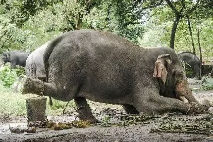 不听话的大象都会长期锁在铁链上,下图是一头叫做Nandan的大象,它已经43岁了,后腿被铁链绑在桩子上,前腿被绑在树上,无法正常躺下,也无法自由的伸直躯体。