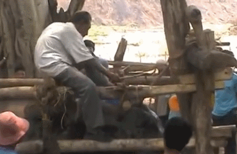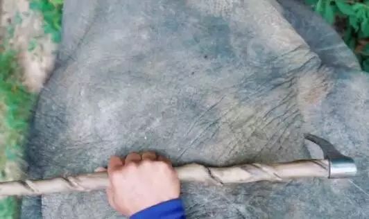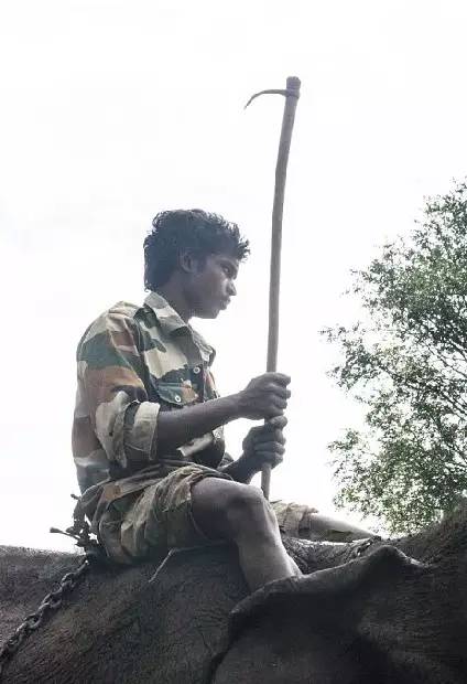 每头大象都有特定的驯象员,他们的四肢都会被铁链锁住,驯象员会用特制的铁钩钩住象耳,鞭打背部,从而训练大象按照指令行动。