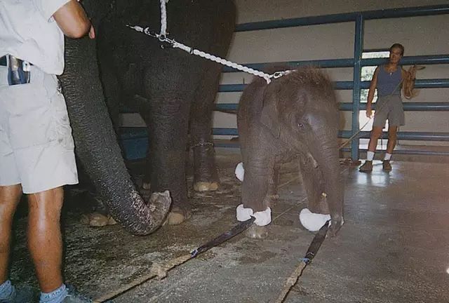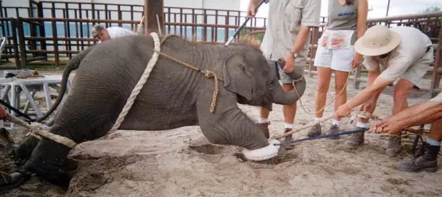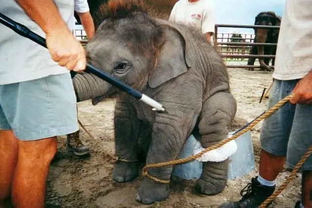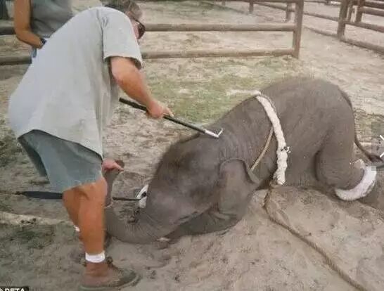 在被问到是不是每头大象都会经受这种残酷的训练,相关人员回答:“这是必须的,因为大象是很敏感且聪明的生物,如果不是这样残忍的训练,磨掉它们的本性,根本不能骑,更不能听指令表演节目。”