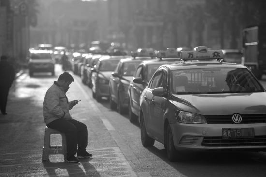 12月18日,新奥燃气树木岭天然气加气站,等待加气的出租车排起了几百米的长队,一直排到了圭塘路上。图/记者辜鹏博