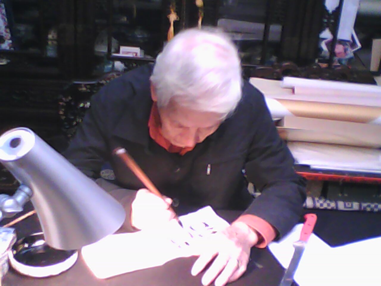 立翁如一个天真的孩子,拿起刀,在一块印石上刻边款。全场宁静,只闻刀石之声,米粒大的小字顾盼生姿,一一显现:“壬辰二月李立八十八矣。”