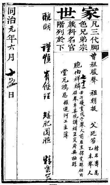 家庭背景是:曾祖骏声,祖父朝拔,父亲廷笏,榜名寿嵩,乙未(道光十五年,1835)举人。胞伯祥麟,壬午(道光二年,1822)优贡,戊子(道光八年,1828)举人,前在直隶完县任内保举卓异,现调补正定府无极县。