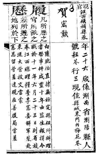六月十五日面试的3人中,有一位叫贺宏勋。根据贺宏勋填写的简历表,他的基本情况是:时为江西候补县丞。二十六岁,湖南省浏阳县人,号耘苓,行三,住浏阳县城东门内梅花巷。其履历是: